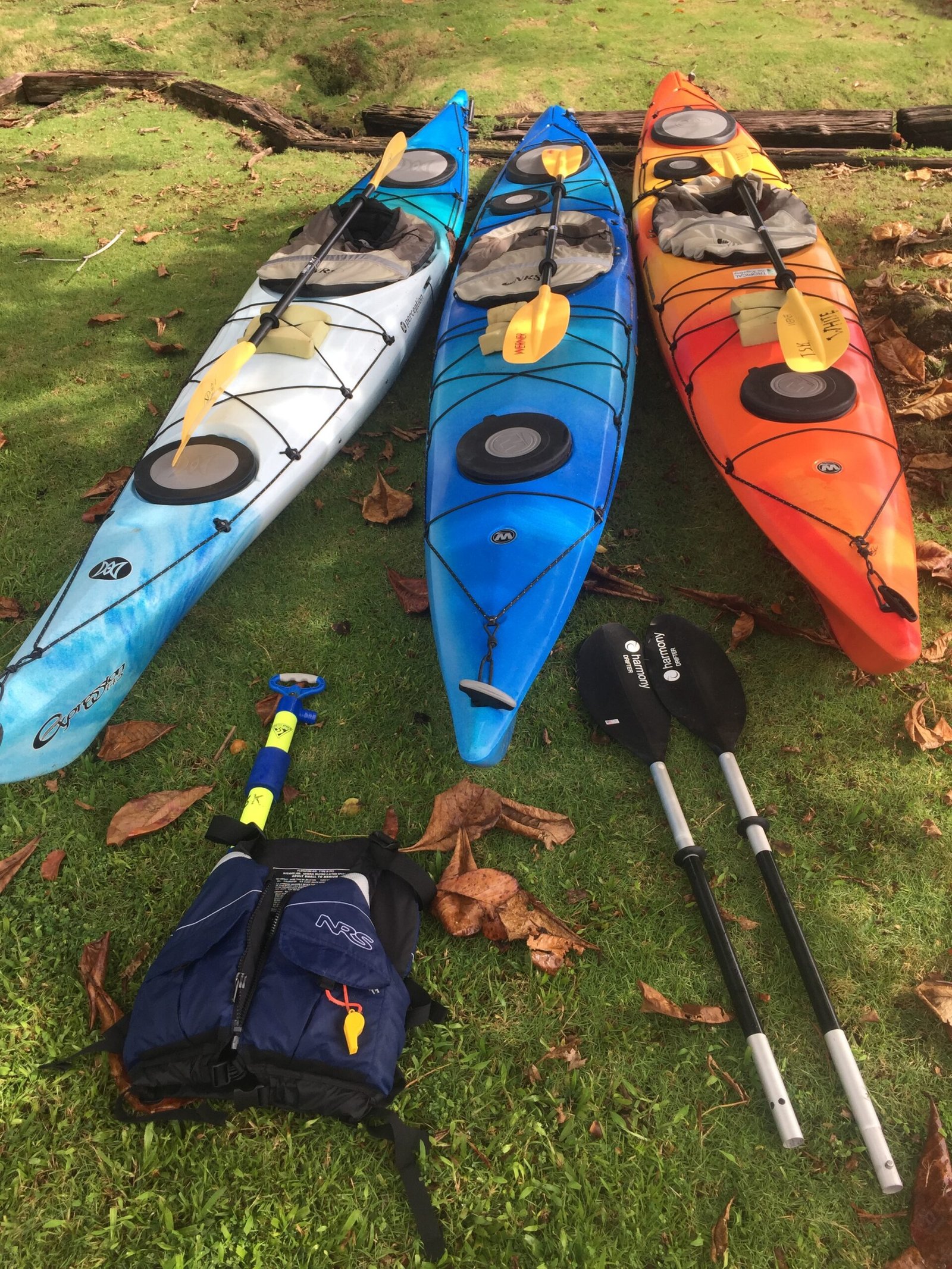 Our fleet comprises Wilderness Systems Tsunami 140s (single), Perception Expression 14.5 (single)& 15.0 (single), and Wilderness Systems Polaris 180 T (Double). Our PFDs are NRS Clearwater Mesh Back, NRS Zoya Mesh Back, and Stohlquist EBB Mesh Back. Our Spray Skirts are Level Six Excursion Spray Skirts, Level Six Splash Deck Spray Skirt, and Inlander by Seal Skirts. They are so new that they don’t have pictures of them in action!. Our paddles are Werner Skagit FG 2 Piece Straight Shaft paddles; below are the specs, including weight:
